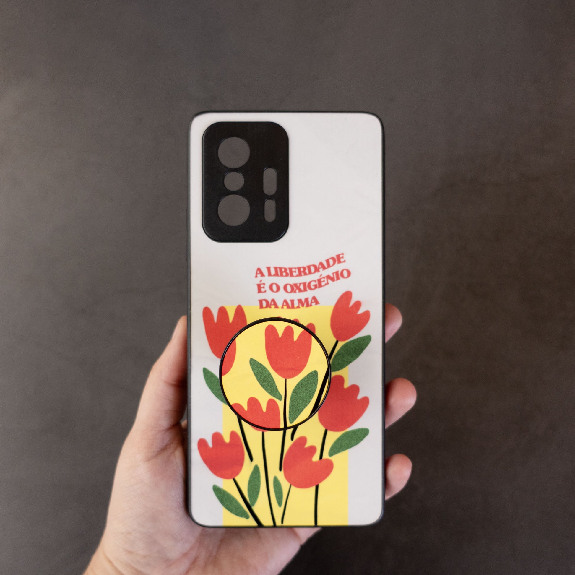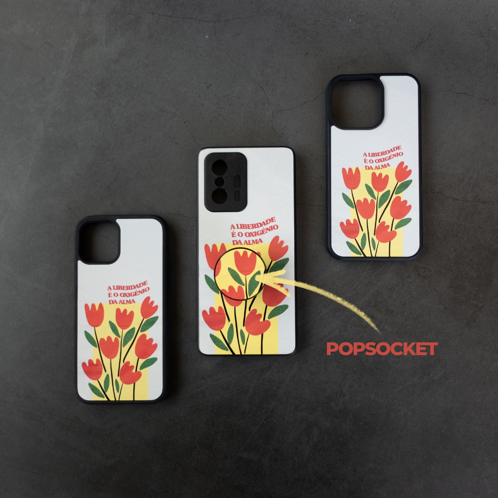 - Podes acrescentar um Pop-Socket que se fundo com o design da capa (enviamos em separado no caso de não quereres colocar ou de preferires ajustar à tua medida)
