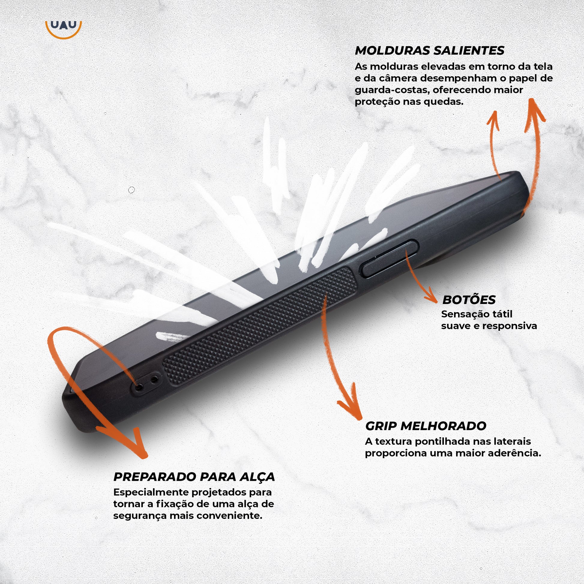 Projetada para fundir a proteção e o design que o teu dispositivo precisa! Molduras à volta das Câmeras e Ecrã mais altas, botões com sensibilidade tátil suave e responsiva, grip lateral extra com textura pontilhada, suporte para alça e ainda forro interior de microfibra. Tudo para amortecer o impactos, evitar arranhões e quedas indesejadas.